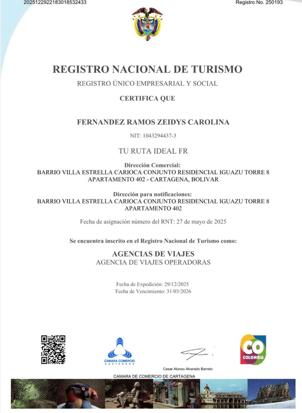 Somos una agencia dedicada a la prestación de servicios turísticos, especializada en la organización y comercialización de experiencias recreativas y tours en destinos turísticos de la región de Cartagena y sus alrededores. Ofrecemos planes que incluyen transporte, acompañamiento, actividades recreativas y experiencias diseñadas para brindar comodidad, seguridad y satisfacción a nuestros clientes. Nuestro objetivo es promover el turismo responsable, resaltando la belleza natural, cultural y ambiental de cada destino, garantizando un servicio de calidad y atención personalizada.